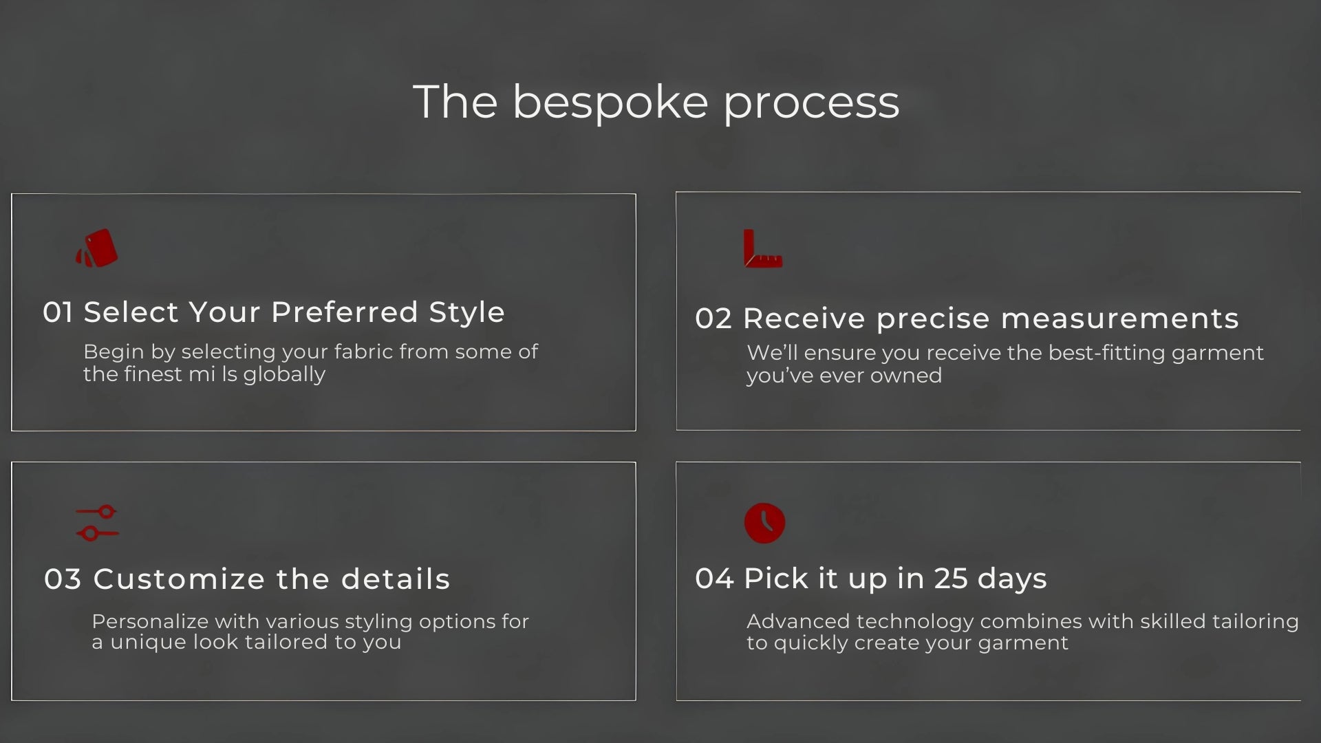 With fabrics of your choosing, our master tailor will measure you to ensure the best possible fit. Our process is meticulous, with every stitch carefully considered and added with unmatched attention to detail.